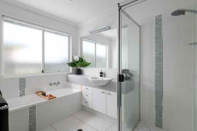 The family bathroom is a masterpiece in itself, featuring a separate bath and shower for ultimate relaxation, plus a separate toilet for convenience. The large laundry, with direct side access, is perfect for busy families, offering ample storage and practicality.