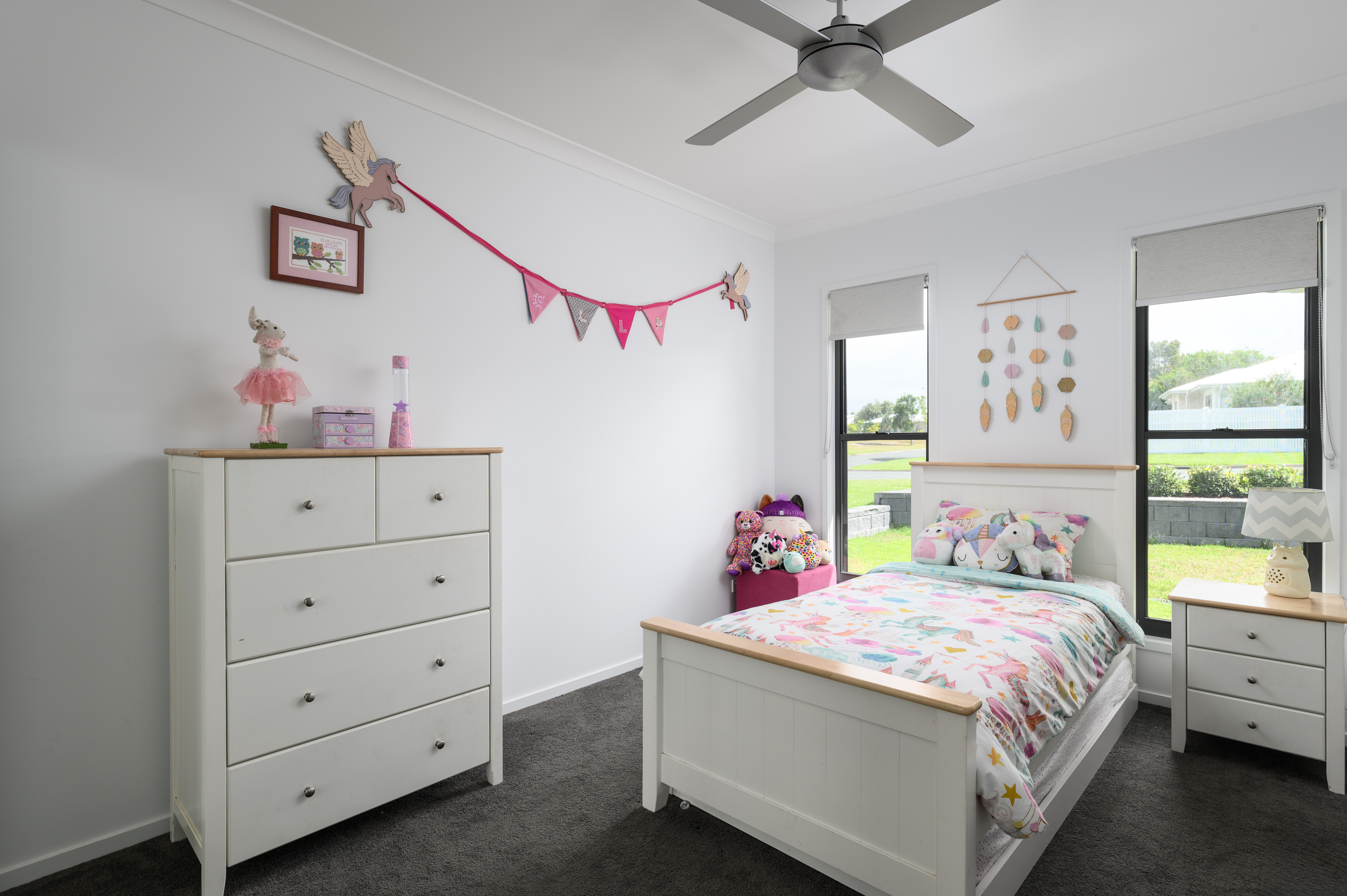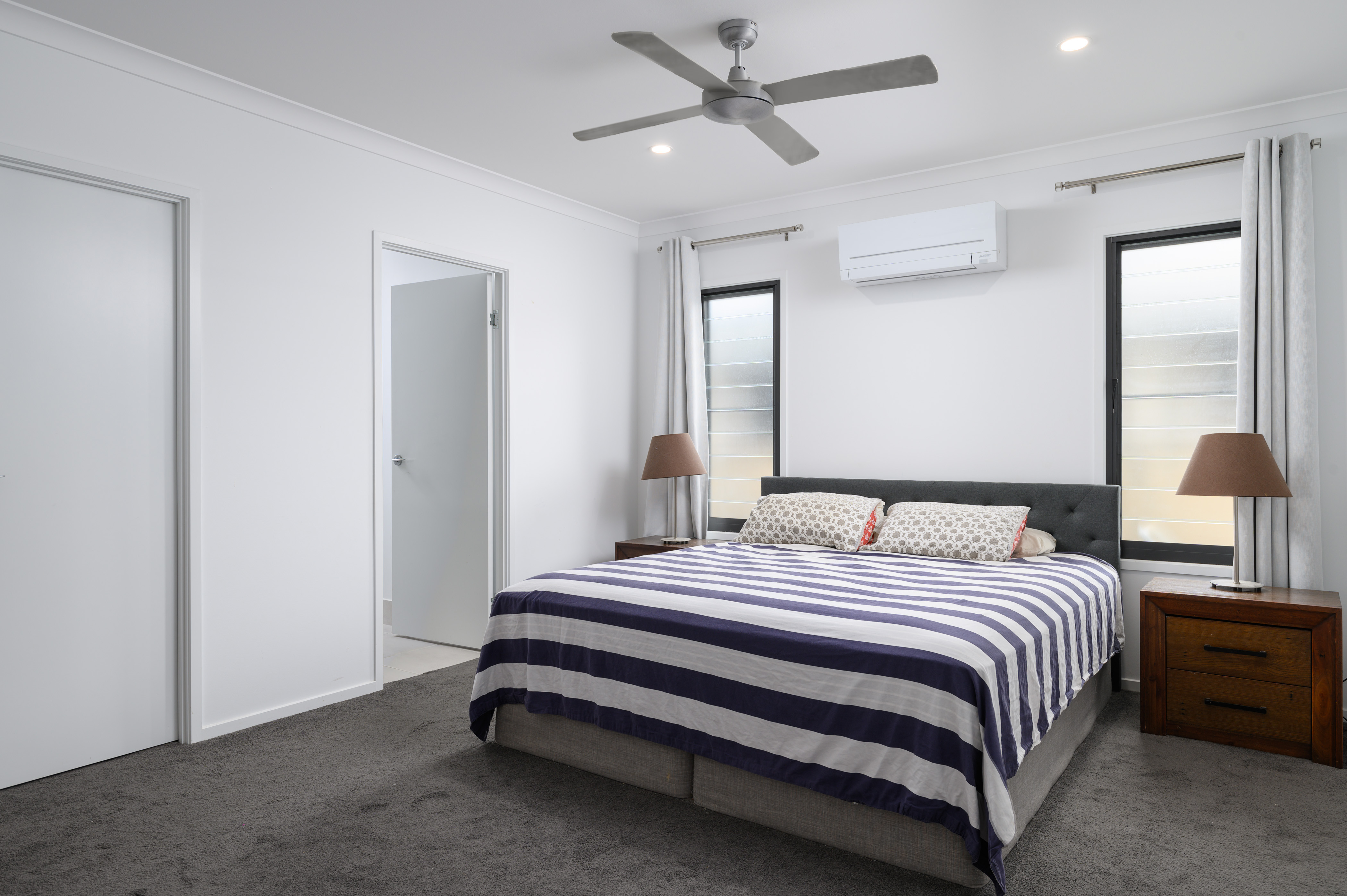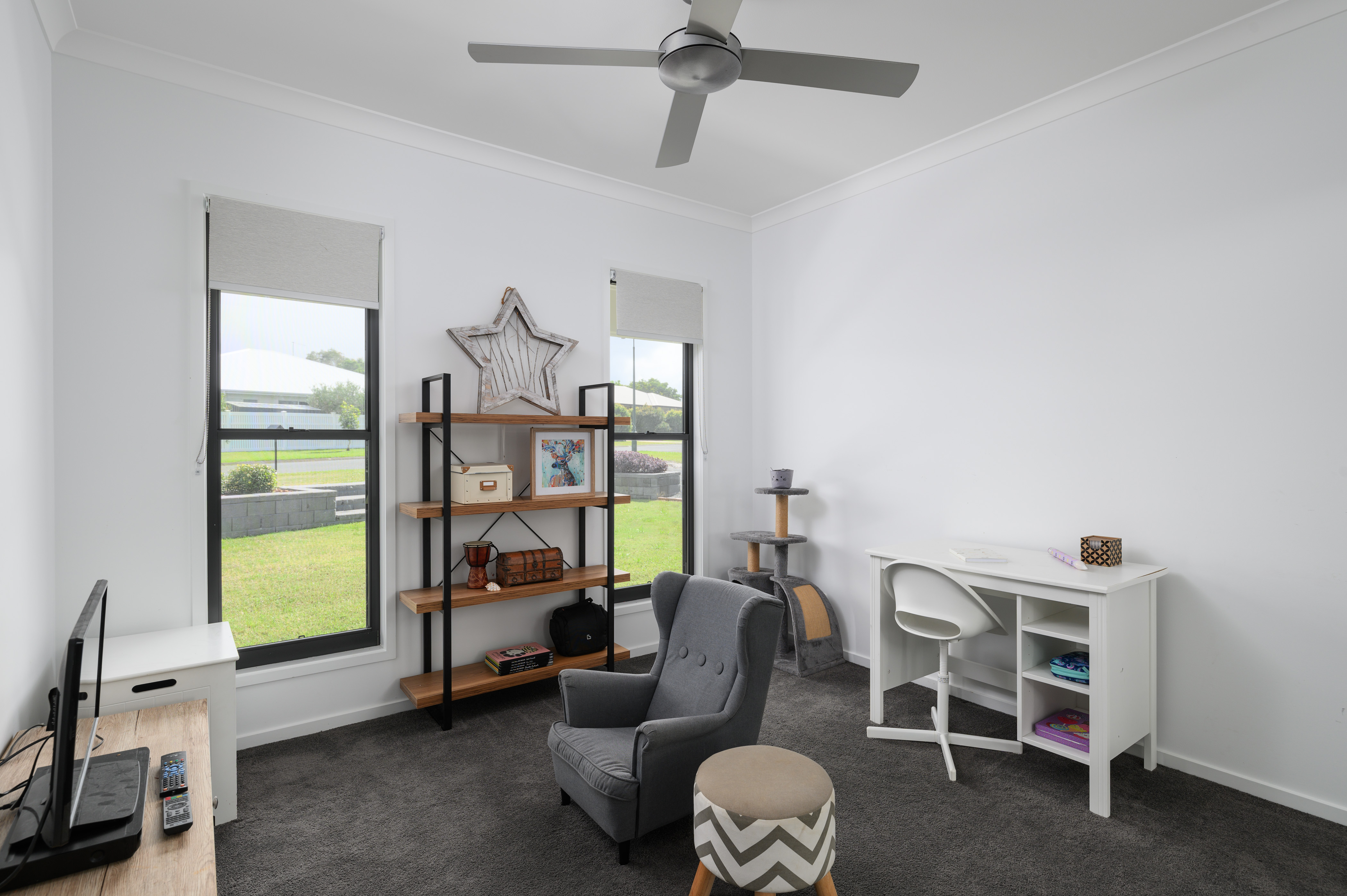 A spacious primary bedroom is tucked away at the rear of the home, with a walk-in robe and generous ensuite featuring a walk-in shower. The remaining bedrooms are at the front of the home with two tucked away in their own wing and one at the front of the home, perfect for guest accommodation or a home office. All the bedrooms feature fans and built-in robes.
