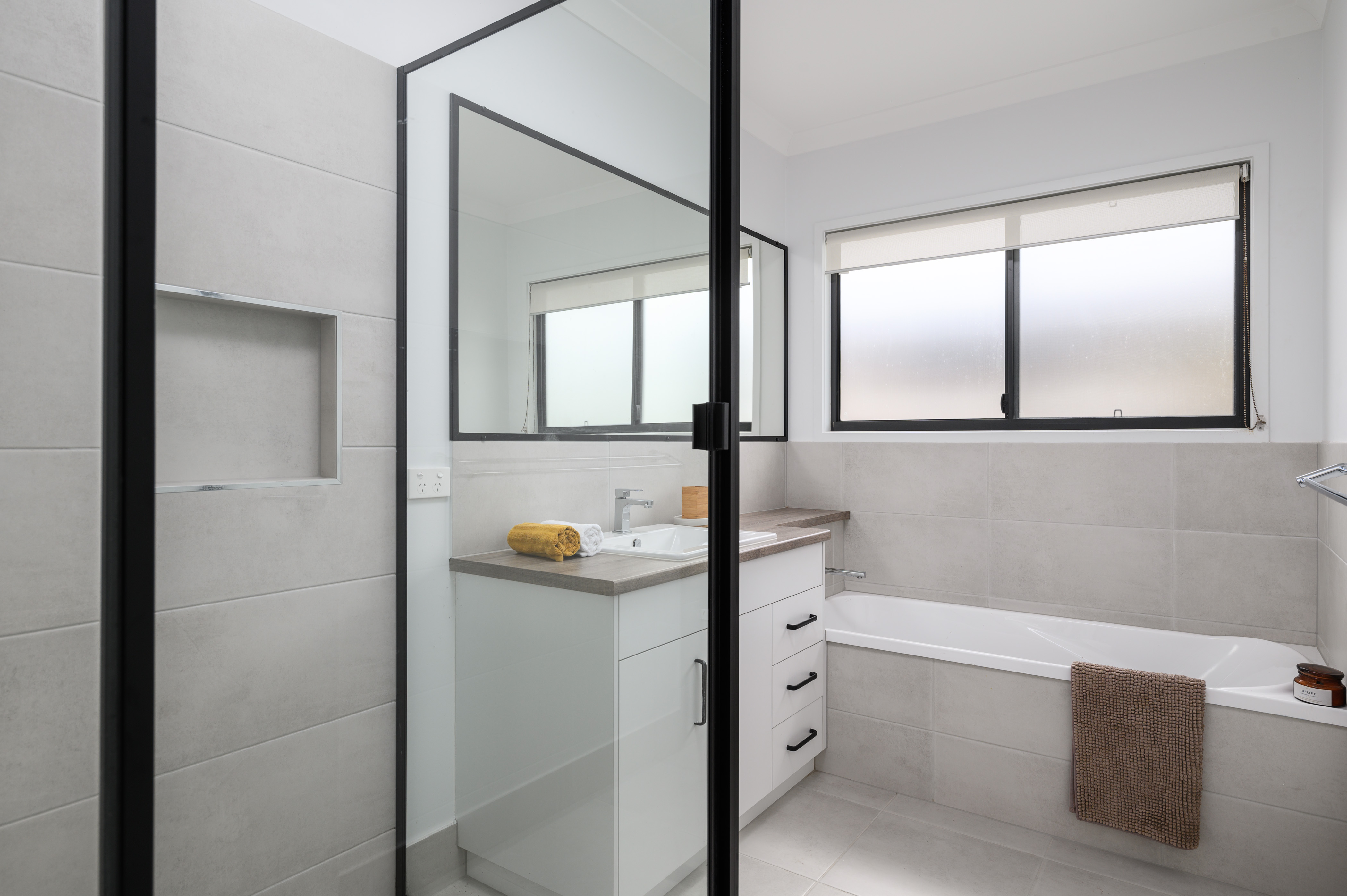 The main bathroom continues the luxe features with a stone vanity, stylish black framed glass shower, and separate bath. The separate powder room with a generous vanity is another luxurious touch that elevates the home. There is so much storage in this home! A walk-in linen closet is such a luxurious touch and is perfectly positioned near the main bathroom and laundry.