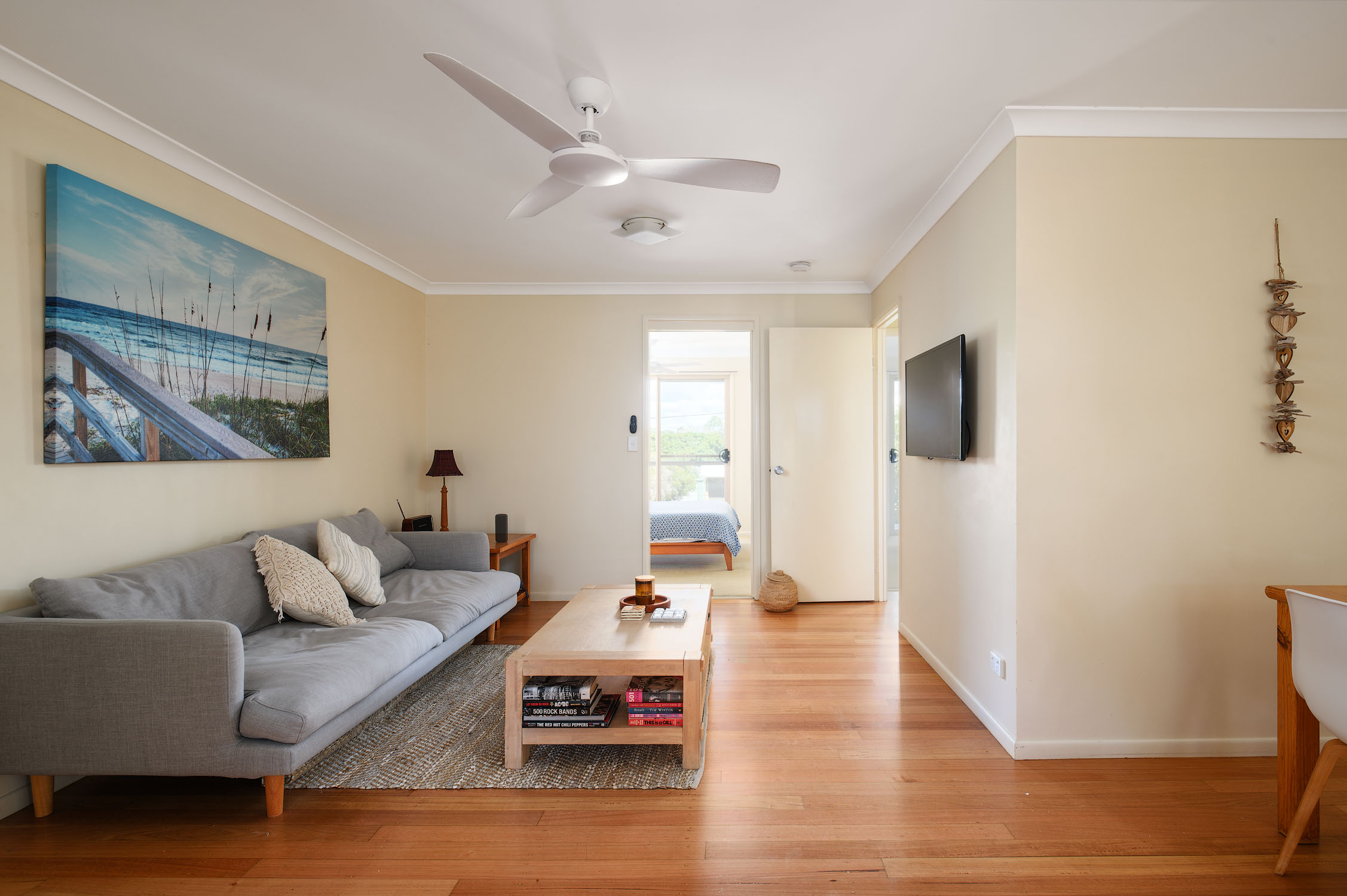 The interior design of this property is complemented by its practical layout. The open plan living area seamlessly integrates the kitchen, dining room, and lounge into one cohesive space - perfect for family gatherings or entertaining guests. The kitchen is equipped with a dishwasher for convenience while the living area extends onto a private balcony providing additional outdoor living space. Built-in robes are included in two bedrooms offering ample storage solutions while ceiling fans ensure comfort during warmer months. Furthermore, the master suite features an exclusive two-way bathroom adding an element of luxury to this inviting residence.